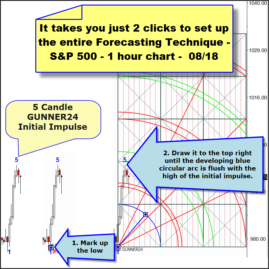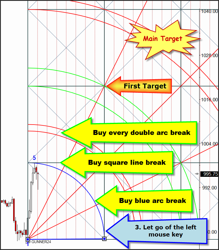 2. When you work with the GUNNER24 Up Setup, you will first have to mark up the low with the second click, the beginning of the initial impulse, and draw it to the top right until the developing blue circular arc is flush with the high of the initial impulse.