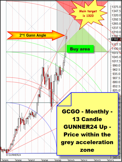 Obviously, because of the rebound from the 2*1 Gann Angle a test of the green support zone was to come up. And that zone offers really strong support. All the fairground barkers who are setting their hopes on a prolonged gold crash will be disappointed. The range for our monster buy with target 1320 is lying between 1100 and 1127.
